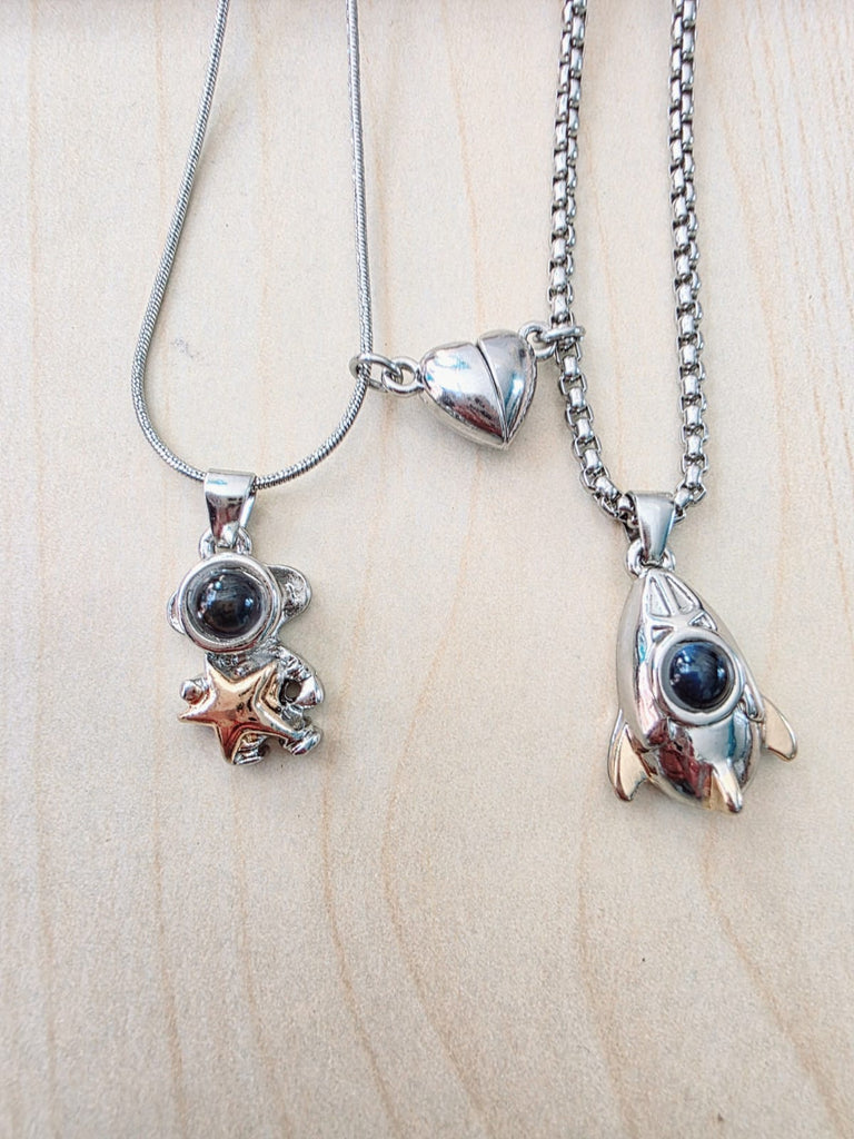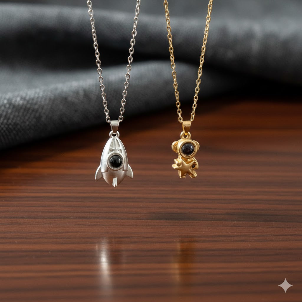 Este collar de pareja combina un astronauta y una nave espacial con un detalle mágico: un visor que proyecta la frase "TE AMO" en 100 idiomas diferentes