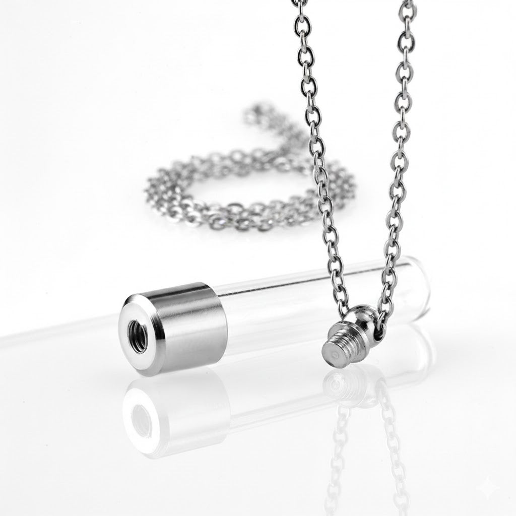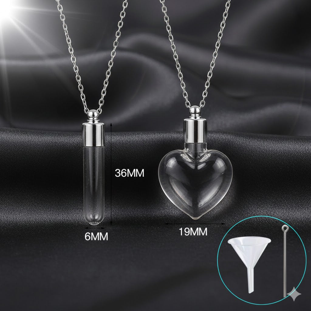 Acero Inoxidable (316L): Utilizado en el colgante de Corazón y en los marcos del vial. Es Hipoalergénico y ofrece Resistencia Extrema contra el óxido y la corrosión.